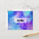Carte postale avec un arrière - plan abstrait cosmique. Couleurs vives et éclatantes de bleu clair, rose et violet. Des étoiles blanches éparpillées un peu partout.