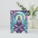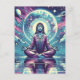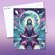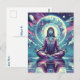 Carte postale de méditation. Un bel air relaxant serein illustration d'une scène bleue et violette avec une femme prenant des médicaments devant la lune, les planètes, les étoiles et la galaxie pour vous donner une ambiance paisible. Plutôt pour une salle de méditation ou un studio de yoga.