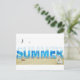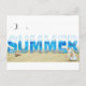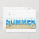 Carte postale avec le mot "SUMMER" en grandes lettres tridimensionnelles remplies d'une scène océanique, dressée contre un arrière - plan de plage de sable. Les lettres sont bleues et transparentes, révélant un monde sous-marin avec des poissons, des bulles et un petit voilier. La plage est claire, avec quelques étoiles de mer et une bouteille contenant un coquillage placé près des lettres.