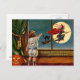 Une belle carte d'Halloween vintage avec un enfant regardant une sorcière volante à travers la fenêtre.