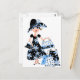 Mignonnes femmes caricaturales en tenue fleurie bleue et noire avec un large casquette à bord et entourées de beaucoup de sacs de courses