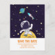 Carte postale de sauvegarde de date avec un fond bleu foncé avec des étoiles jaunes dispersées autour. Superposé au-dessus est une illustration d'un astronaute portant un costume d'astronaute blanc flottant au-dessus de la lune. Faisant signe de la main en explorant l'espace. Au loin, il y a une planète avec des anneaux et un vaisseau spatial volant dans l'espace.