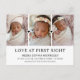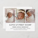 Faire-part de naissance moderne avec trois photos avec coeur lié le long du haut. "L'amour au premier regard" en police et nom classiques, état de naissance en police moderne. Au dos se trouve une autre photo avec un message personnalisable.