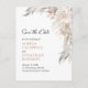 Boho Blush Rose Séché Palm Leaf Eucalyptus Élégant Foliage Enregistrer la carte de date... Notre carte postale chic florale Save the Date présente une rose rose rose rousse de style bohème dans une cascade d'eucalyptus et de feuilles verts flottants. Le verso de la carte contient votre adresse de retour, les informations du site Web du mariage et un modèle graphique de code QR que vous pouvez remplacer par votre propre graphique de code. Tous les exemples de texte des deux côtés de la carte peuvent être facilement révisés avec vos propres détails sur le modèle de personnalisation.