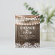 Carte de changement de date de mariage rustique avec un fond de tonneau de chêne campagnard, guirlande de lumières scintillantes, fleurs de bébé respirant, votre monogramme et un modèle d'enregistrement de la date. Trouvez d'autres cartes de changement de plan sur www.zazzle.com/special_stationery.