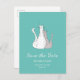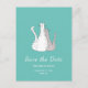 Carte de faire-part de mariage dessin animé dessiné à la main Enregistrer la date sarcelle verte avec un dessin de chats branchés et une conception de script. Avec des lettrages personnalisables, vous pouvez ajouter vos noms et informations de mariage. Idéal pour planifier votre journée spéciale avec un thème félin.