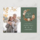 Cette élégante carte de rendez-vous de mariage comporte une belle couronne de feuilles et de fleurs aquarelles terracotta, taupe et brunes avec une photo des mariés sur un fond vert sauge.