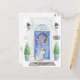 Annoncez votre nouvelle adresse avec notre faire-part élégante avec un chat persan, une porte d'entrée bleue, un tapis de bienvenue, une ardoise, des topiaires et une couronne fleurie posée sur un arrière - plan en brique grise.