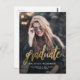Carte postale moderne faire-part graduation avec photo verticale personnalisée. Le mot "diplômé" apparaît dans le script de faux feuille d'or, avec le nom du diplômé, l'école et l'année de graduation ci-dessous en blanc sans serif. Remplacez facilement l'image de l'échantillon par la photo de votre diplômé. Un écran de dégradé noir permet de s'assurer que le texte s'affiche. Personnalisez l'adresse de retour au verso. Idéal pour obtenir un diplôme d'études secondaires ou collégiales.