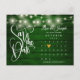 Cette carte de dattes élégante comporte de jolies lampes à cordes, un calendrier et un coeur d'amour or chic mettant en valeur votre date spéciale sur un arrière - plan rustique en bois vert émeraude. Le verso contient des détails supplémentaires sur la date, y compris votre site Web mariage, avec votre adresse de retour et l'espace pour l'adresse de votre destinataire. Conçu par Thisisnotme© ***POUR DÉPLACER LE COEUR À VOTRE DATE SPÉCIALE, REGARDEZ À DROITE DE L'IMAGE DU PRODUIT OÙ IL DIT "PERSONNALISER LE MODÈLE". SI VOUS CLIQUEZ SUR LE TEXTE BLEU "DÉTAILS", VOUS VERREZ OÙ VOUS CUSTOMISEZ LE TEXTE. EN BAS, IL EST DIT "CLIQUEZ POUR CUSTOMISER PLUS LOIN". CLIQUEZ SUR CELA ET VOUS POURREZ DÉPLACER LE COEUR À LA DATE VOULUE.***