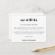 Lorsque les circonstances exigent malheureusement de reporter votre mariage, une carte postale vous permettra de le faire savoir à vos invités. Ce design typographique minimal en noir et blanc est entièrement personnalisable. Personnalisez facilement le texte à l'avant et à l'arrière. Vous pouvez également modifier les styles et les couleurs des polices et des couleurs arrière - plans si vous le souhaitez via l'option customiser plus loin. Si vous avez besoin d'aide, s'il vous plaît envoyez-moi un message.