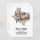 Vous êtes dans le grand état du Texas ? Assurez-vous que tous vos amis savent comment vous trouver à votre nouvelle adresse avec ces annonces émouvantes! Script manuscrit à travers la forme d'état et un mélange de polices ci-dessous. Customisez les couleurs à votre préférence - l'état, les flèches et n'importe quel mot. Design disponible en rose vif, vert menthe, prune à sucre, cantaloupe, mauve de cassis, néo menthe, jaune moelleux, bleu ciel, or muet. Aussi options dans Texas A & M Aggies maroon et Longhorns brûlé orange. Produits correspondants disponibles.