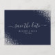 Elégant mariage bleu marine et argent, enregistrez les cartes postales datées avec parties scintillant argent sur un arrière - plan bleu marine. Ce mariage chic, à l'exception des cartes postales datées, est parfait pour un mariage élégant et luxueux bleu marine et argent. Éléments correspondants disponibles.