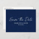 Mariage rustique bleu marine minimaliste enregistrez la carte postale date avec un arrière - plan bleu marine burlap.