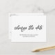 Carte Postponement Mariage moderne avec un design simple avec les mots, "changer la date" dans une police d'écriture manuscrite de brush noir sur un arrière - plan blanc. Le côté arrière a votre message personnel et l'adresse de retour pour faciliter l'envoi. Un design élégant et minimaliste pour annoncer que votre mariage a été reporté.