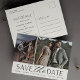 Une moderne carte postale pour enregistrer la date conçue pour accueillir deux photos de fiançailles alignées côte à côte. "Enregistrer la date" apparaît sous vos photos dans une élégante écriture manuscrite et en lettres majuscules, avec vos noms, date de mariage et lieu de mariage en dessous. Les cartes postales sont retournées pour montrer les détails supplémentaires pour enregistrer la date, y compris votre site web de mariage, avec votre adresse de retour et un espace pour l'adressage du destinataire.