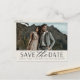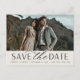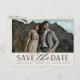 Une carte postale moderne enregistrer la date conçue pour accueillir votre photo fiançailles horizontale ou paysagère préférée. "Enregistrer la date" apparaît sous votre photo en bloc blanc et en écriture de script, avec vos noms, date mariage et emplacement du mariage sous. Les cartes postales sont inversées pour afficher d'autres détails sur la date, y compris votre site Web mariage, avec votre adresse de retour et l'espace pour l'adresse du destinataire.