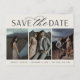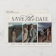 Une carte postale moderne pour la date conçue pour accueillir trois photos fiançailles alignées côte à côte. "Enregistrer la date" apparaît sous vos photos en bloc chic et en écriture de script, avec vos noms, date mariage et emplacement du mariage sous. Les cartes postales sont inversées pour afficher d'autres détails sur la date, y compris votre site Web mariage, avec votre adresse de retour et l'espace pour l'adresse du destinataire.