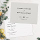 Cette simple et élégante carte postale de mariage "save the date" présente un design intemporel et minimaliste. Le réglage par défaut pour la couleur du texte sur le devant est noir, et la couleur de fond par défaut est liée aux tons gris clair. Vous pouvez préférer changer la base en blanc ou une autre teinte de votre choix. Vous pouvez le faire simplement en sélectionnant l'une des couleurs de base à vue dans les outils d'édition, ou vous pouvez préférer ajouter un numéro de couleur hexadécimal spécifique que vous avez trouvé lors de vos recherches. La base au dos de la carte postale est réglée pour être simplement la couleur du papier, car nous avons choisi d'utiliser une base claire avec le texte d'exemple. Nous n'avons choisi aucune couleur. Prenez note cependant que si vous choisissez de conserver le symbole esperluette au dos entre vos noms, le style et la couleur de ce symbole ne peuvent pas être modifiés. Vous pouvez ajouter une couleur de votre choix au dos comme base, qu'elle soit blanche ou autre chose, et/ou changer la couleur de base sur le devant, selon vos goûts. Vous pouvez vouloir les rendre tous les deux de la même couleur de votre choix, peut-être blanc ou quelque chose de similaire ou autre, totalement différente. Ou vous pouvez préférer une tonalité de base différente pour chaque côté. Vous pouvez également supprimer le texte "carte postale" au dos si vous préférez un look plus