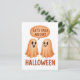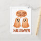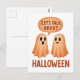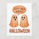 Deux fantômes de dessins animés avec des expressions différentes s'engagent dans une conversation. Au-dessus d'eux, une bulle de discours dit "Parlons d'Halloween".