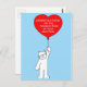 Un grand chat blanc moelleux tenant un gros ballon rouge avec les mots "Félicitations pour avoir finalisé votre adoption" sur lui.