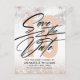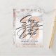 Carte postale moderne et tendance de Save The Date pour un anniversaire Sweet 16. Le design présente le numéro 16 en rose gold sur un fond en marbre rose gold et paillettes, avec une typographie script 'enregistrez la date' et des détails en caractères gras.