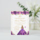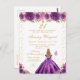 Cette invitation d'anniversaire élégante et glamour présente une belle princesse aux cheveux blonds et à la peau claire dans une robe de bal violette foncée. Le texte combine une écriture manuscrite et des polices modernes sans serif pour un look classe et sophistiqué. Les arrangements floraux, les papillons et les confettis dorés créent le mélange parfait de rustique et de chic.