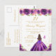 Cette invitation de fête d'anniversaire élégante et glamour présente une belle princesse aux cheveux bruns et à la peau claire dans une robe de bal violette foncée. Le texte combine une écriture manuscrite et des polices modernes sans serif pour un look classe et sophistiqué. Les arrangements floraux, les papillons et les confettis dorés créent le mélange parfait de rustique et de chic.