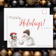 Carte postale de vacances personnalisée mignonne et drôle avec l'illustration d'un bonhomme de neige en colère contre le hibou qui a cassé son ami. Illustré et dessiné par Patricia Alvarez.