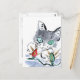 Lien, Lien... Le chaton gris est très perplexe au-dessus des lumières de Noël clignotantes rouge et vert pour l'arbre de Noël. Sumi-e, peinture à l'encre japonaise en couleur. Artiste Ellen Miffitt @ Nine Lives Studio