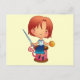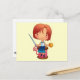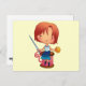 Une mignonne fille de dessin animé aux cheveux rouges, assise sur une bobine géante de coton rose, tenant une aiguille et un bouton jaune avec 4 trous.