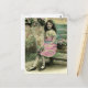 Carte postale colorée d'une fille assise sur un banc avec des fleurs sauvages dans un panier et un bouquet.