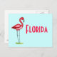 Carte postale illustrant une illustration unique d'un flamant debout dans un petit bassin d'eau. Fond d'aqua clair, texte rouge. Lit "Floride".