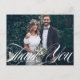 Fleurissement de script élégant Photo mariage remerciement blanc Carte postale de remerciement | Remerciez votre famille et vos amis d'avoir partagé votre jour spécial avec cette carte de remerciement personnalisable. Elle présente un lettrage "merci" et une typographie serif.