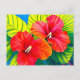Carte Postale Fleurs rouges d'hibiscus hawaïen avec feuilles ver