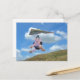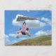 Le cochon vole. Poupée et deltaplane sont des jouets au crochet de fil. L'image montre un piglet volant au-dessus d'une colline herbeuse parmi des nuages blancs moelleux. Contredit le sentiment que rien n'est impossible.