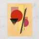 Un triangle noir divisé en segments, une bande trapézoïdale noire divisée en deux, un cercle rouge, un rectangle jaune, un carré rouge pâle, un cercle pourpre, et un carré orange sont des éléments de cet art abstrait de formes imbriquées par Richard H. Fay.