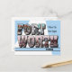 Grandes Lettres de voeux Carte postale de Fort Worth, TX - Où commence l'Ouest. (Contrairement à Dallas où l'est se déplace). De grandes images vintage Iconiques remplissent les grandes lettres épelant le nom.