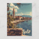 Illustration vintage captivante de Split, ville historique sur la côte dalmate de Croatie. Le design met en valeur l'architecture romaine antique, les vues magnifiques sur le littoral et les rues animées qui définissent cette belle destination. Avec une esthétique nostalgique et rétro, l'oeuvre met en valeur le riche patrimoine de Split et le charme méditerranéen, invitant à découvrir son charme intemporel.