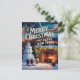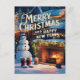 Un joyeux bonhomme de neige admire une cheminée douillette, diffusant des réjouissances sur une carte postale de Noël.