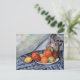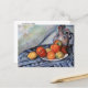 Carte postale avec la peinture impressionniste de Paul Cezanne (1839-1906) intitulée Fruit and Jug on a Table (1894). Une vie morte avec une assiette de fruits, dont des citrons et des pommes, à côté d'une cruche en grès sur une nappe bleue.