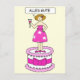 A cartoon lady in pink, holding a cocktail and standing on large cake saying 'Bonne chance' which is Happy Birthday' in German.