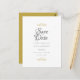 Ce chic enregistrer la carte date comporte des colombes et des coeurs d'or au-dessus et au-dessous de votre enregistrer les détails de la date définie dans la typographie classique élégante.