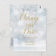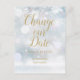 Cette élégante carte de changement de date typographique or dispose d'un script élégant changer notre date au-dessus de vos détails set dans élégante typographie or moderne sur un arrière - plan de gel hivernal flocons. Le verso contient des détails supplémentaires, y compris votre site Web mariage, avec votre adresse de retour et l'espace pour l'adresse de votre destinataire. Conçu par Thisisnotme©