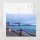 A photograph captures the iconic Golden Gate Bridge in San Francisco, shrouded in a thick layer of fog. The bridge's red structure stands out against the soft blue sky and the misty water below. The foreground features a chain-link fence and a concrete post, leading the viewer's eye towards the majestic bridge.