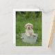 Purebred golden retriaturve puppy taking a bath outdoors in a cream colored vintage washtub sitting in the grass with her paws on the edge. She est à adorable fluffy blonde fawn baby dog with brown eyes and a black nose.