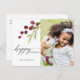 Cette carte postale photo présente des baies peintes d'aquarelle rouge et une branche de pin avec les mots "Joyeuses fêtes" Envoyez une joie de vacances à votre famille et à vos amis.
