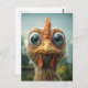Un gros plan humoristique et très détaillé d'un poulet aux grands yeux bleus exagérés, aux plumes moelleuses et à l'expression délirante, dressé contre un arrière - plan extérieur aux tournesols douces.