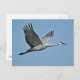 Cette photo capture une grue de sable en vol contre un arrière - plan de ciel bleu. Les grues de Sandhill sont hautes, avec de longues jambes, de longs cous, du plumage gris et des têtes rouges sans plumes. Ils se nourrissent de grenouilles, de poissons et d'insectes. Contrairement aux hérons et autres échassiers, les grues se nourrissent aussi de la végétation, notamment des graines, des fruits et des plantes aquatiques. Chaque année, les grues en vol sont un spectacle familier puisqu'elles entreprennent des migrations saisonnières en Amérique du Nord.
