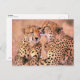 Carte d'animal montrant un couple de guépards en Afrique du Sud. Le guépard (Acinonyx jubatus) est un grand félin habitant la majeure partie de l'Afrique et certaines parties de l'Iran. Le guépard peut courir plus vite que n'importe quel autre animal terrestre, jusqu'à 112 à 120 km/h (70 à 75 mph). en courtes rafales sur des distances allant jusqu'à 500 m (1 600 pieds), et a la capacité d'accélérer de 0 à 100 km/h (62 mph) en trois secondes. Sa principale stratégie de chasse consiste à poursuivre des proies rapides telles que diverses espèces d'antilopes et de lièvres. Presque chaque facette de l'anatomie du guépard a évolué pour maximiser son succès dans la poursuite, résultat d'une course aux armements évolutive avec ses proies. En raison de cette